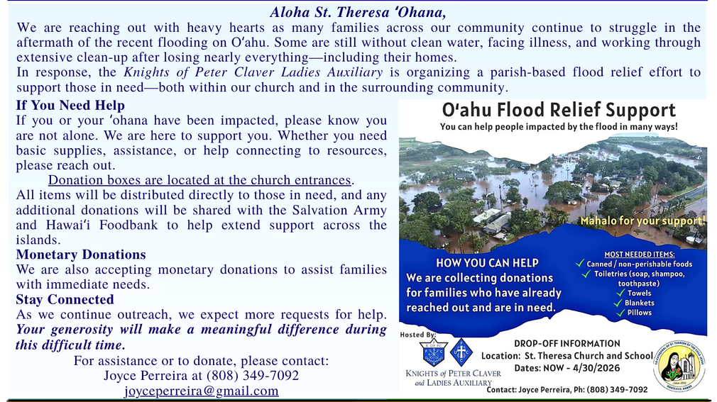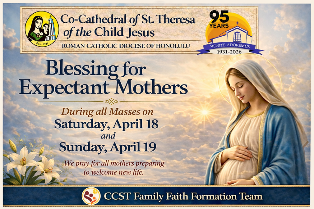 We the people of the Co-Cathedral of Saint Theresa of the Child Jesus, seek to be an example of the presence of God through our Christian Catholic worship, education, service, and stewardship of all God's gifts. We celebrate our diversity of age, culture, language, and viewpoints as a sign of God’s all-powerful and ever-present love in our community of faith. We strive to witness the gospel of Jesus Christ to evangelize and to respond in love, as well as compassion to our community in Honolulu, to be a welcoming place to all who seek the grace, fellowship, and love of God.