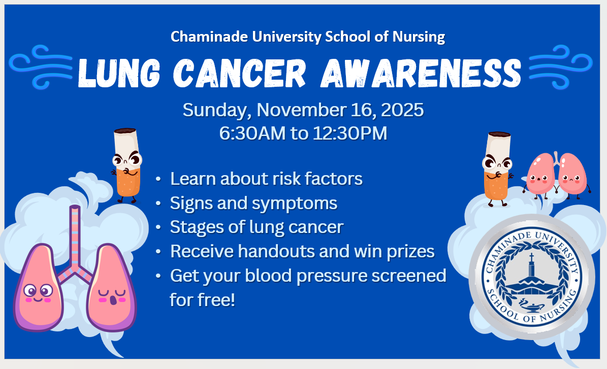 The Chaminade University Nursing Students will be presenting and educating on Lung Cancer Awareness and Prevention. Please join us on Sunday, November 16, 2025, from 6:30 am - 12:30 pm, where you’ll learn about the risk factors, signs and symptoms, and the different treatments available.